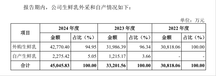 发行人采购数据显示,主要原材料生鲜乳从2022年到2024年的采购金额占比分别为59.76%、58.25%、53.79%。而公司生鲜乳外购和自产情况显示,2022年到2024年外购生鲜乳占比分别高达100%、96.34%、94.95%,自产占比仅为0%、3.66%、5.05%。